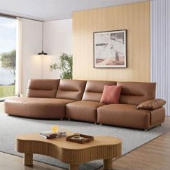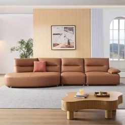 Ghế sofa cong hiện đại bằng da sinh thái Ghế sofa bọc nệm 4 chỗ ngồi có ghế dài bên trái rộng cho phòng khách, văn phòng, màu nâu